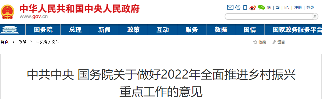 2月22日,《中共中央 国务院关于实行2022年全面推进乡村振兴重点工作的意见》正式发布。