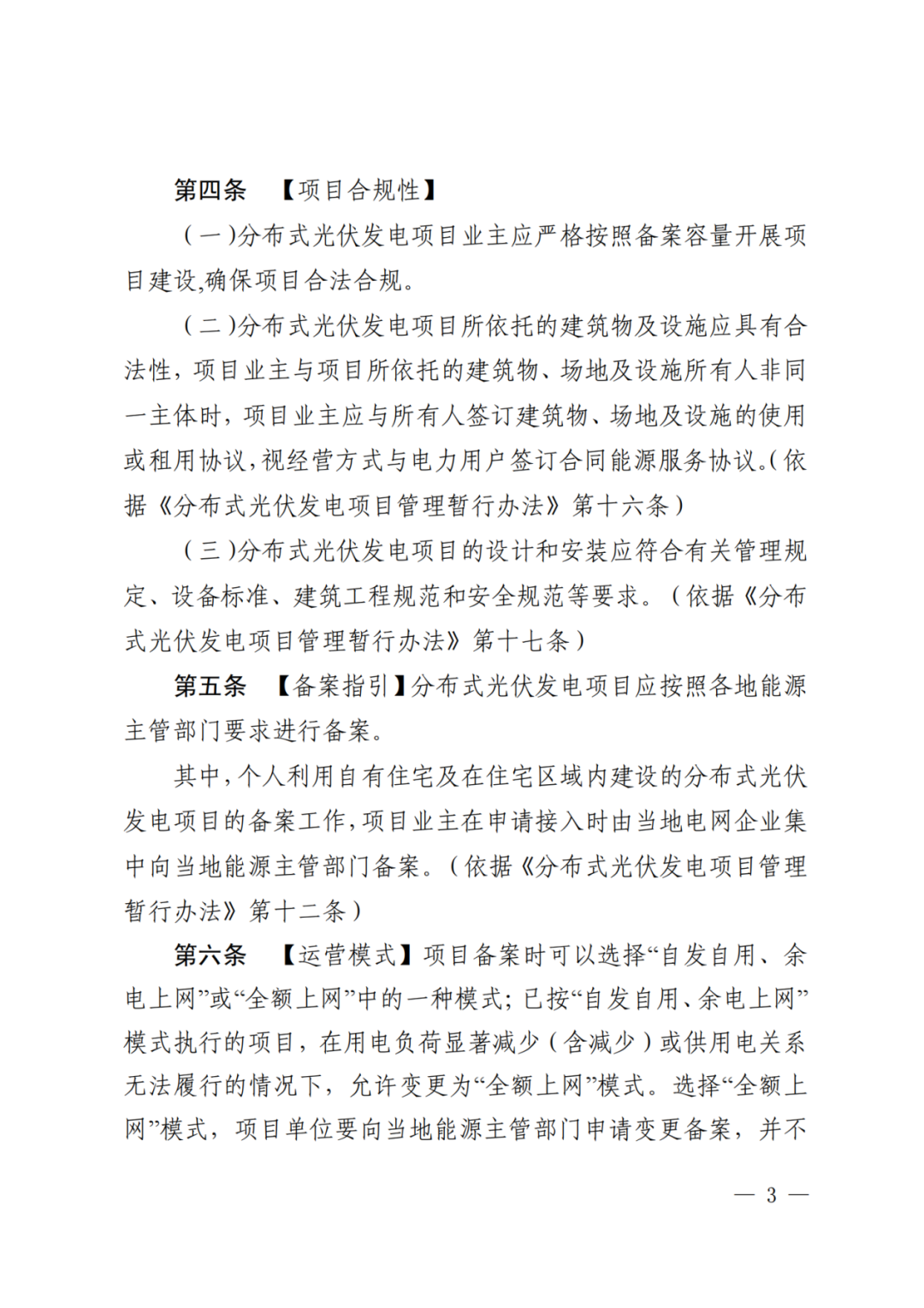 项目主要包括业主自建的户用自然人分布式光伏项目和就地开发、就近利用且单点并网容量小于6兆瓦的户用光伏以外的各类分布式光伏发电项目。文件从项目合规性、备案指引、运营模式、接入电压、并网流程等方面进行了规定。本指引自印发之日起试行,有效期2年,内容详细,对全国其他地区具有参考意义。