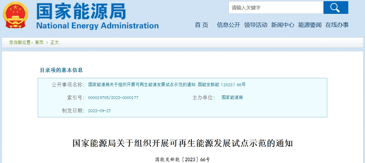 2023年10月18日,国家能源局发布的《关于组织召开可再生能源开展试点示范的通知》【国能发新能〔2023〕66号】指出,到2025年,组织实施一批技术先进、经济效益合理、具有较好推广应用前景的示范项目,有助于形成一系列相对成熟完善的支持政策、技术标准、商业模式等,有力促进可再生能源新技术、新模式、新业态开展。