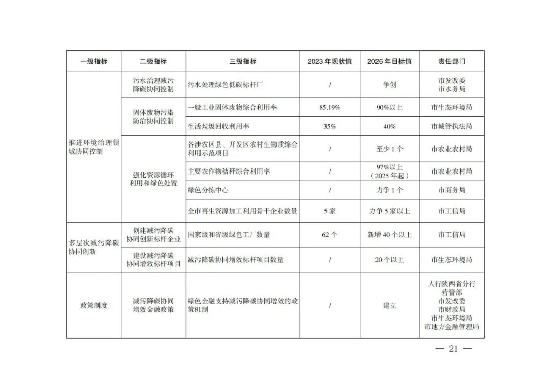 到2026年,形成一套减污降碳协同创新管理机制、模式路径和政策举措,构建“4+3+3+6”减污降碳协同创新“西安模式”,即召开能源、交通、工业、环境治理4个领域的减污降碳协同创新,在园区、企业、项目3个层次培育和遴选减污降碳协同创新标杆,出台减污降碳协同增效金融政策、碳评纳入环评新机制、碳排放信息纳入排污许可管理新机制3项减污降碳协同创新政策,提升市级层面试点工作机制创新、减污降碳协同创新评价指标体系创建、大气污染物与温室气体融合清单编制、污染物与温室气体监测核算、固定污染源排放量全口径核算、协同管理创新6种减污降碳协同管理和创新能力。投资约262亿元,推进66个减污降碳协同创新重点项目建设,确保全市非化石能源占能源消费比重达到22%以上,单位GDP能耗、主要污染物总量减排和单位GDP二氧化碳排放降低率完成省上下达目标。碳排放强度下降与生态环境质量改善协同推进取得明显成效,减污降碳协同度达到同类型城市领先水平,绿色低碳循环开展的经济体系初步形成。